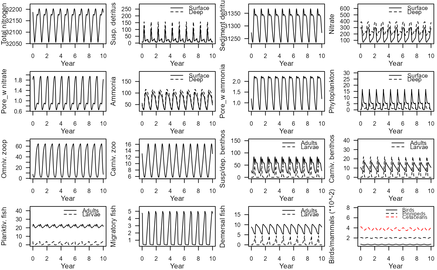 Be warned that if the run is more than about 10 years then the plot becomes extremely compressed and messy. It is not intended to be of publication quality. The intention is to provide a quick-look diagnostic of trends in the state variables. This is useful to assess whether the model is close to stationary state or not.